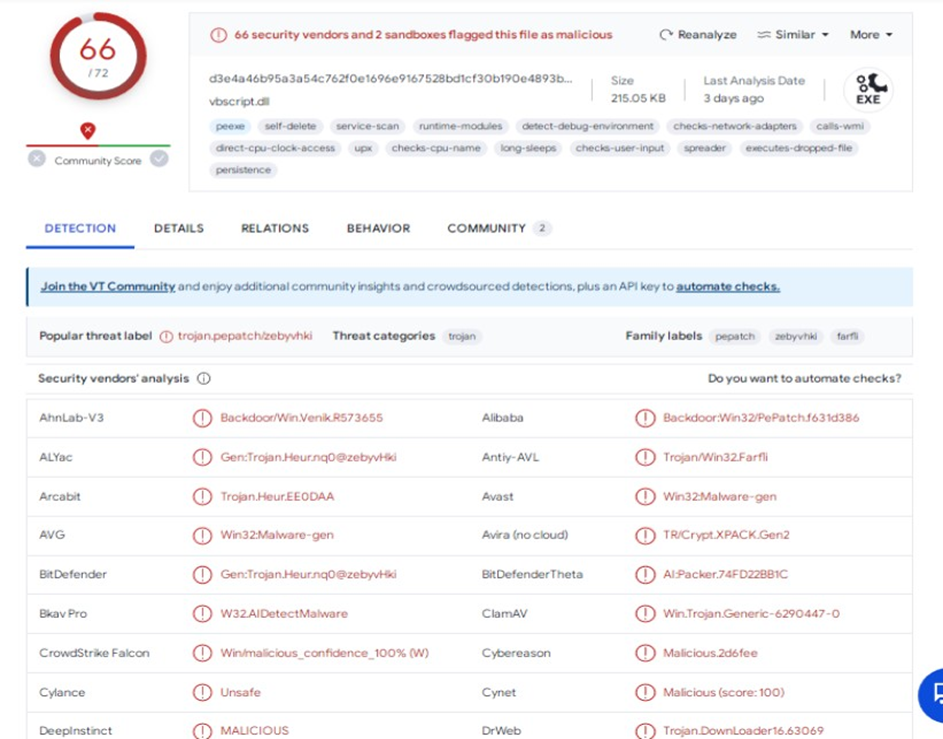 - 72개의 백신 중 66개의 백신이 악성 파일로 진단
