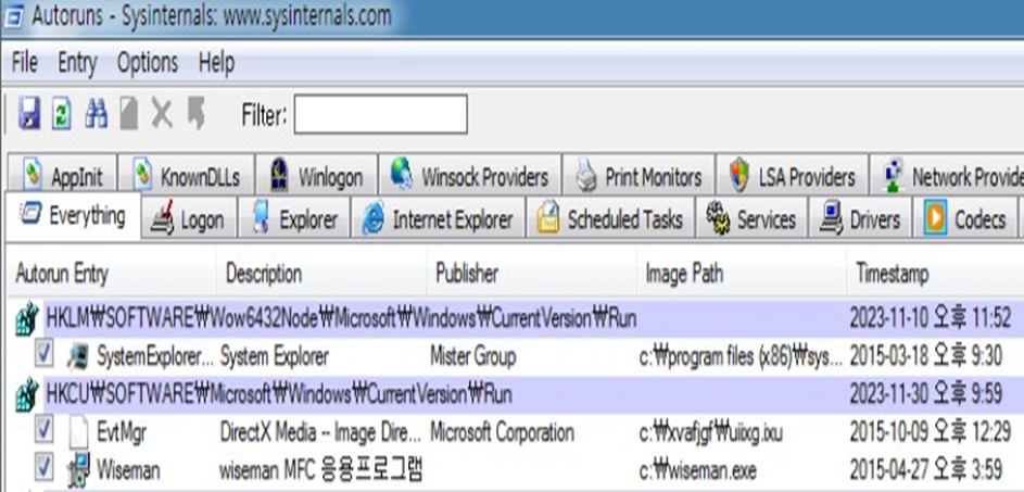 - EvrMgr 파일과 Wiseman 파일이 부팅 후 자동으로 실행되는 프로그램에 등록된 것을 확인할 수 있었다