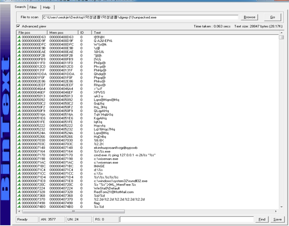 - bintext 도구를 사용하여 IP, 도메인 주소, 실행파일, 명령어, 함수 등의 정보를 확인할 수 있다