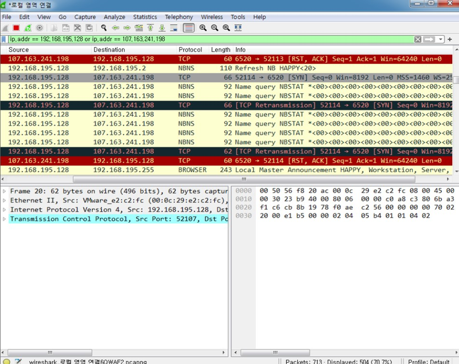 - wiseshark를 통해 특정 Ip주소에 지속적인 통신 시도 행위 확인