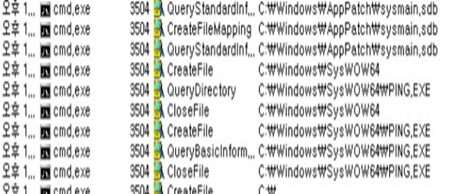 - cmd.exe 프로세스가 ping 명령어 사용을 위해 PING.EXE 파일을 실행하는 모습을 확인